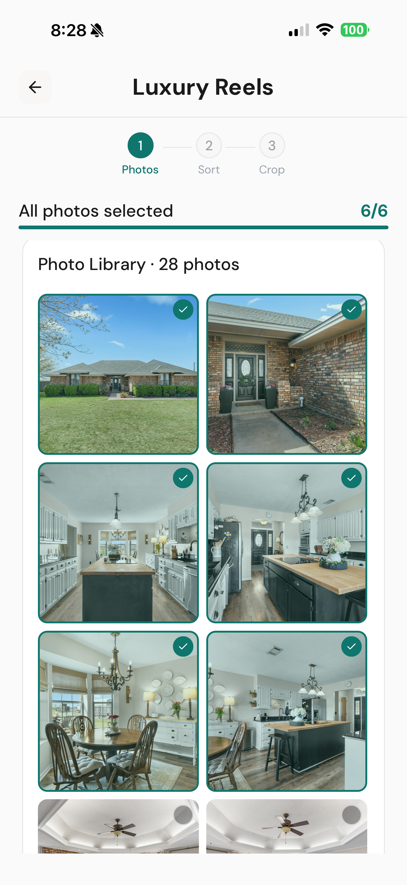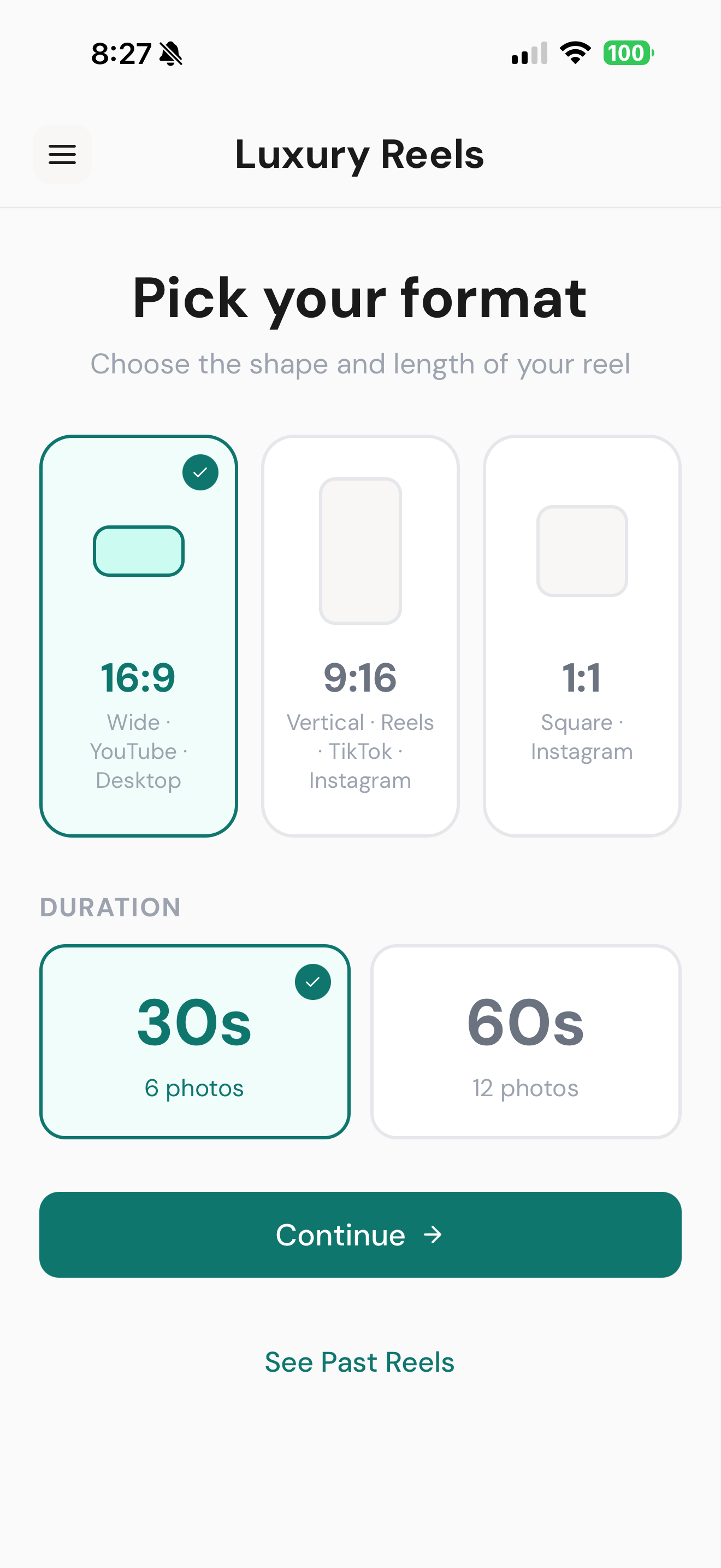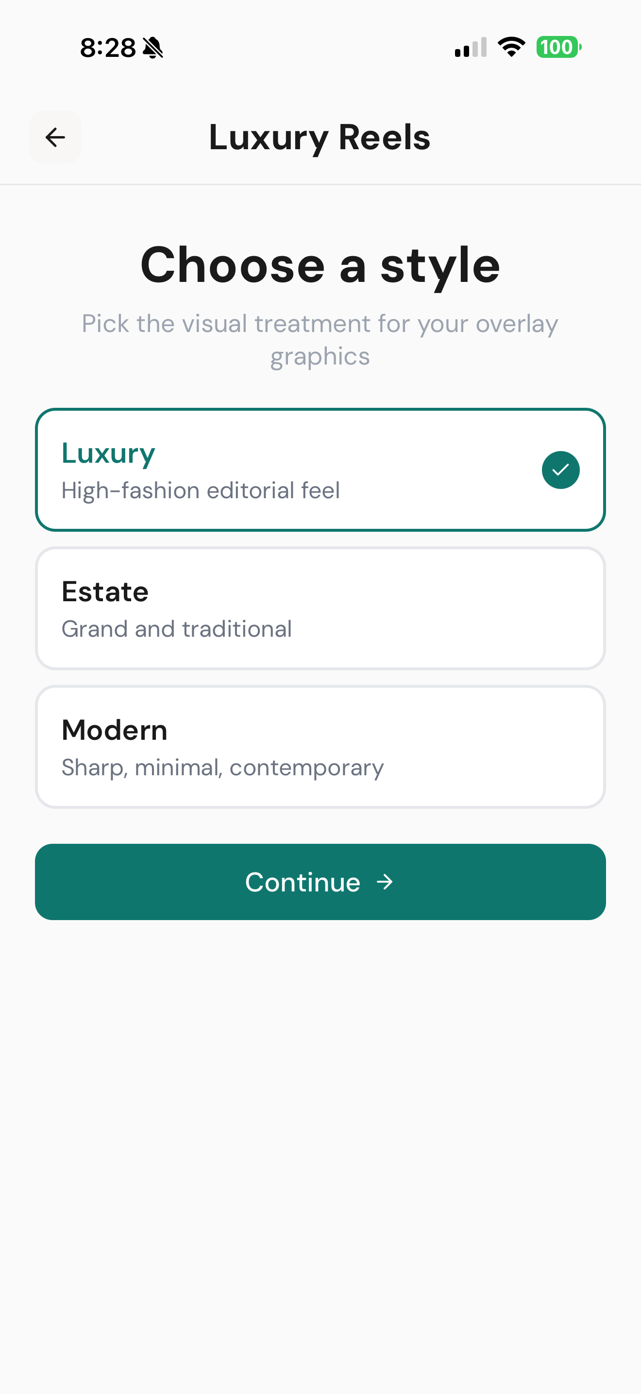 Choose your aspect ratio (9:16, 1:1, or 16:9) and treatment — Luxury, Modern, or Estate. Add your brokerage logo once and it auto-applies to every reel.